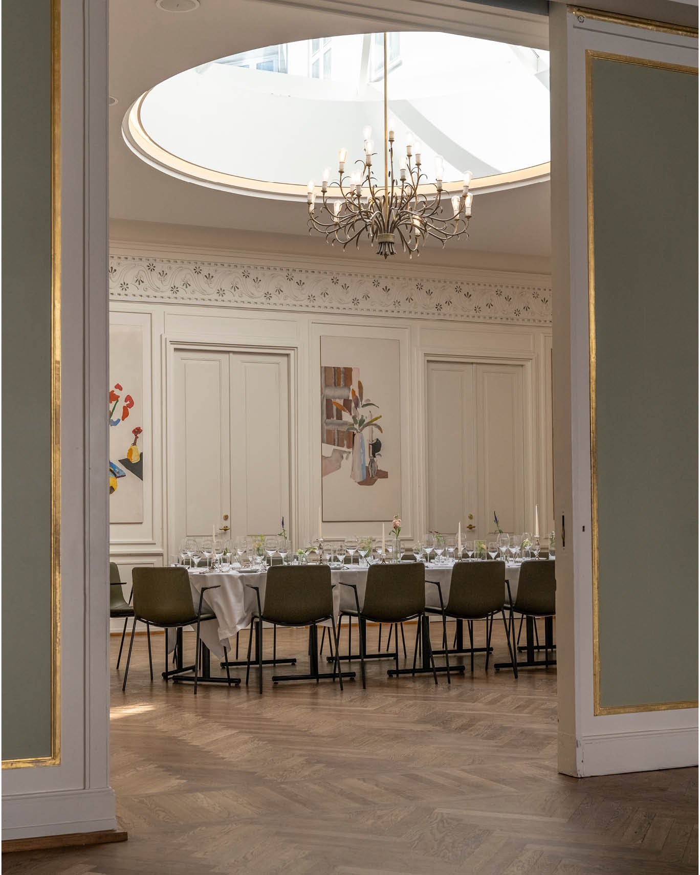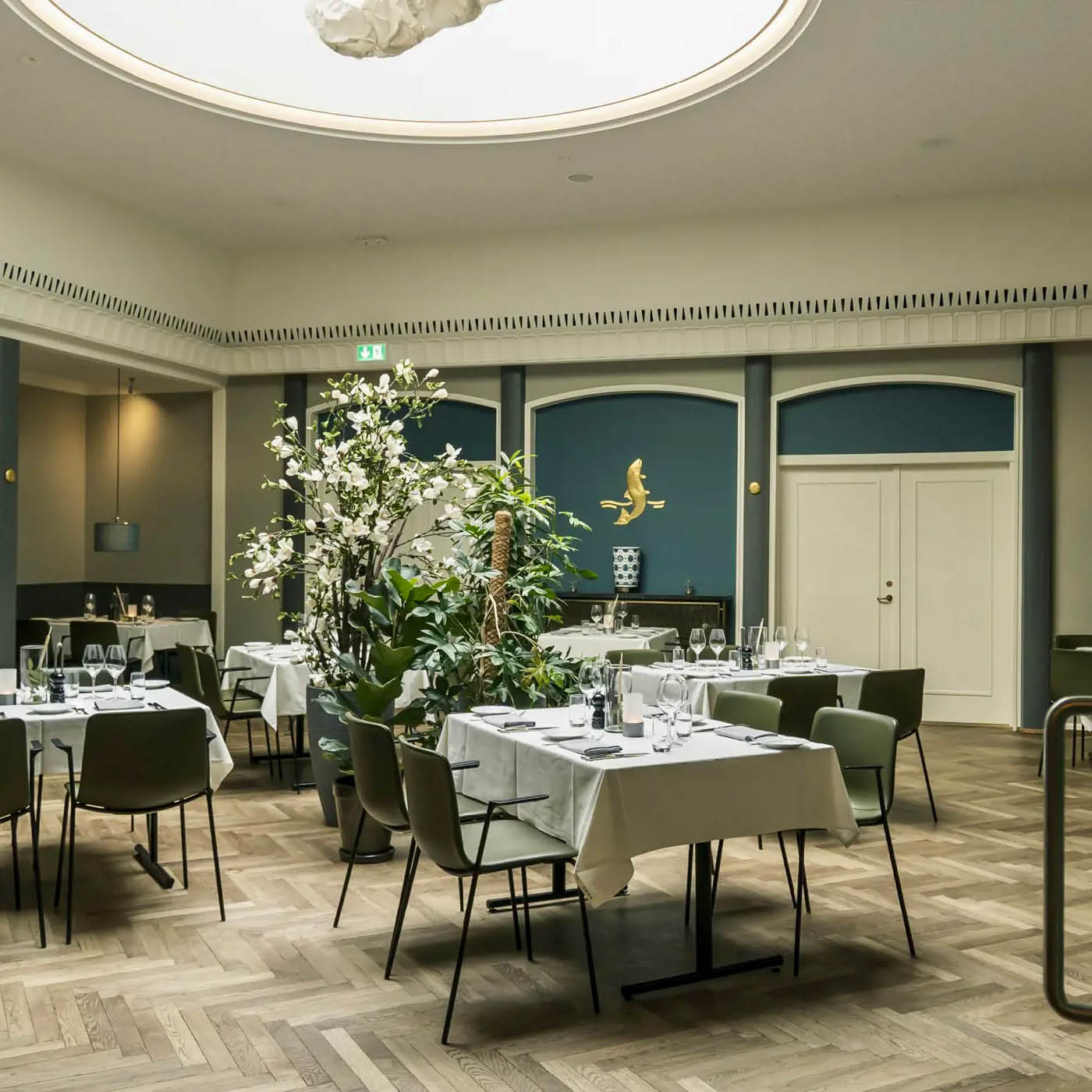 Den kunstneriske sal er perfekt til mellemstore selskaber. Salens store lyskuppel skaber et fantastisk lys i lokalet, og står i flot kontrast til de blå farver.