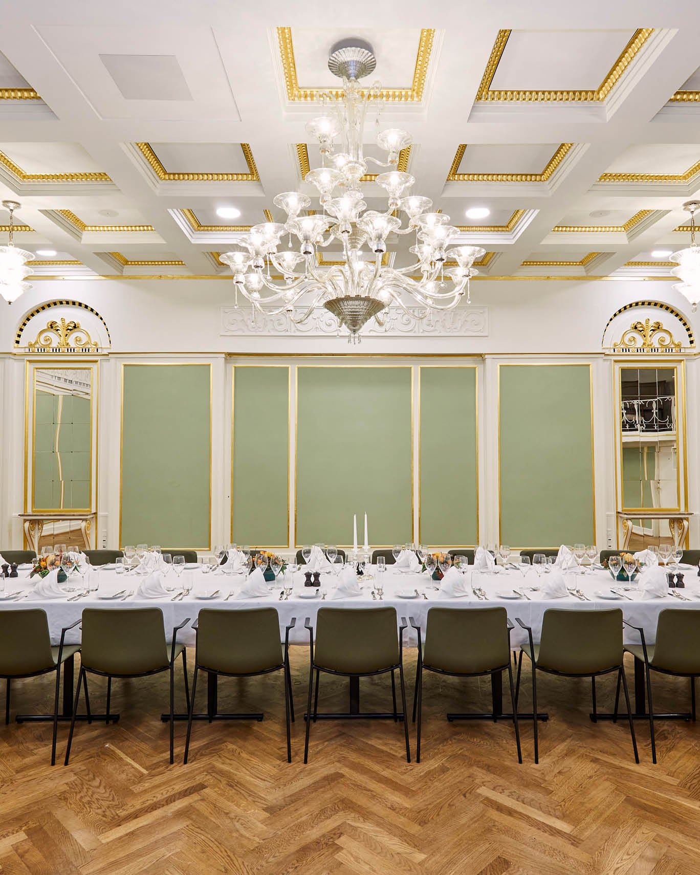Festsalen er hotellets største sal, og har siden 1927 dannet rammen om et utal af store og små begivenheder. Væggene og lofterne er garneret med bladguld, og den venetianske lysekrone med svungne arme er lavet i Ungarn af italienske glaskunstnere. Lysekronen suppleres af mindre lysekroner i lokalets hjørner.
