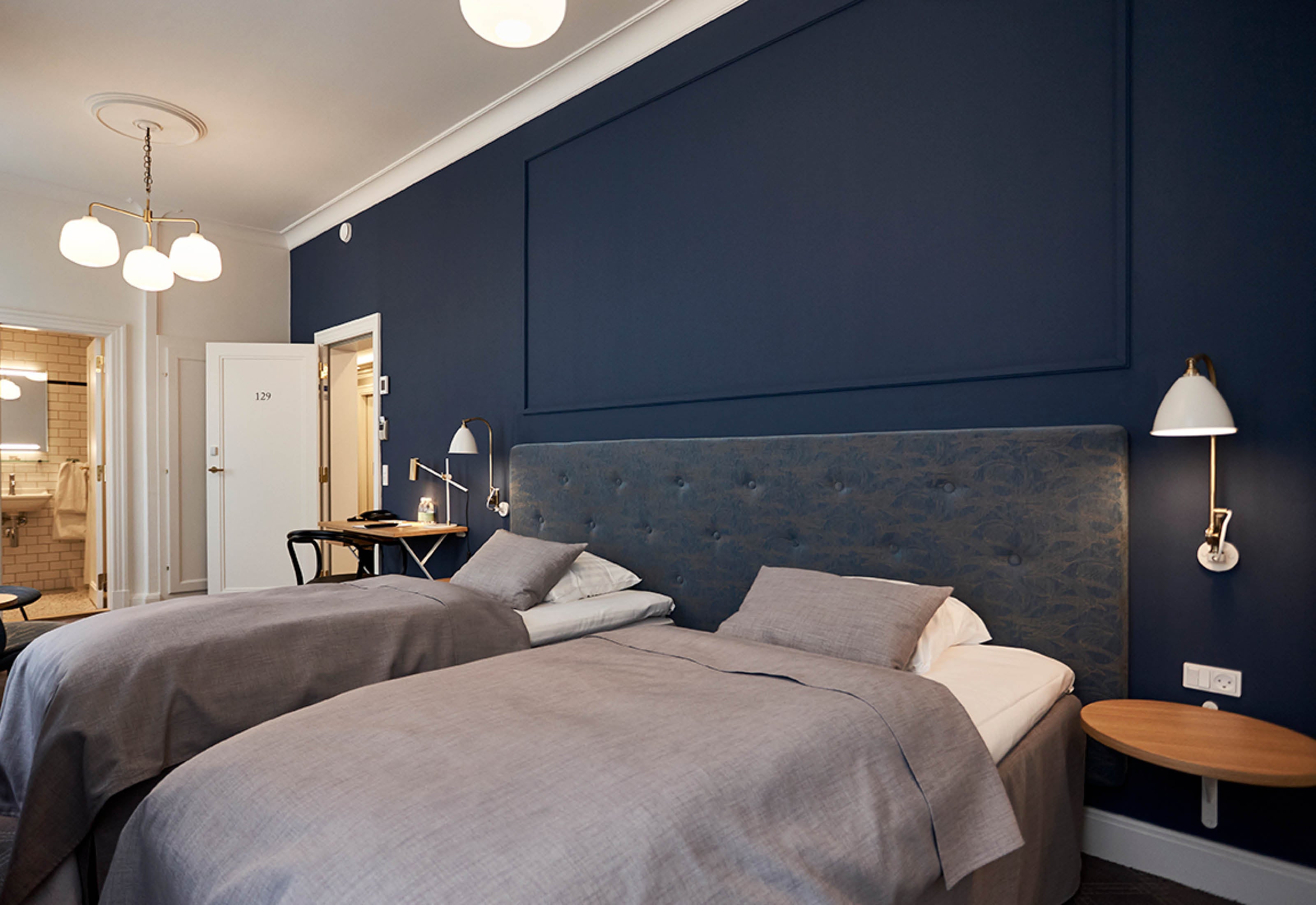 All rooms were renovated in 2016 and each has its own stylish charm with its different designs. A twin room has everything you need when you are on the move. The beds are 90 x 200 cm, and the room also contains a desk and chair. The decor is kept in calm shades, creating a relaxing atmosphere.