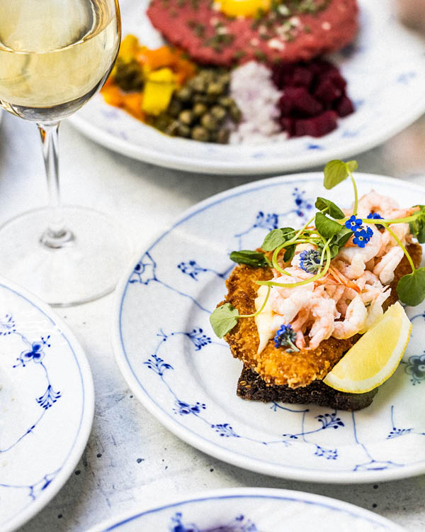 Mathisens fiskeanretning med friteret kuller, fiskerillette, håndpillede rejer, citron og smørristet franskbrød