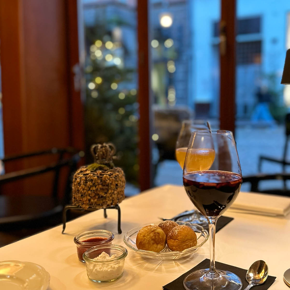 Hjemmebagte æbleskiver, julekompot og Fruens hvide gløgg eller Mathisens klassiske røde gløgg